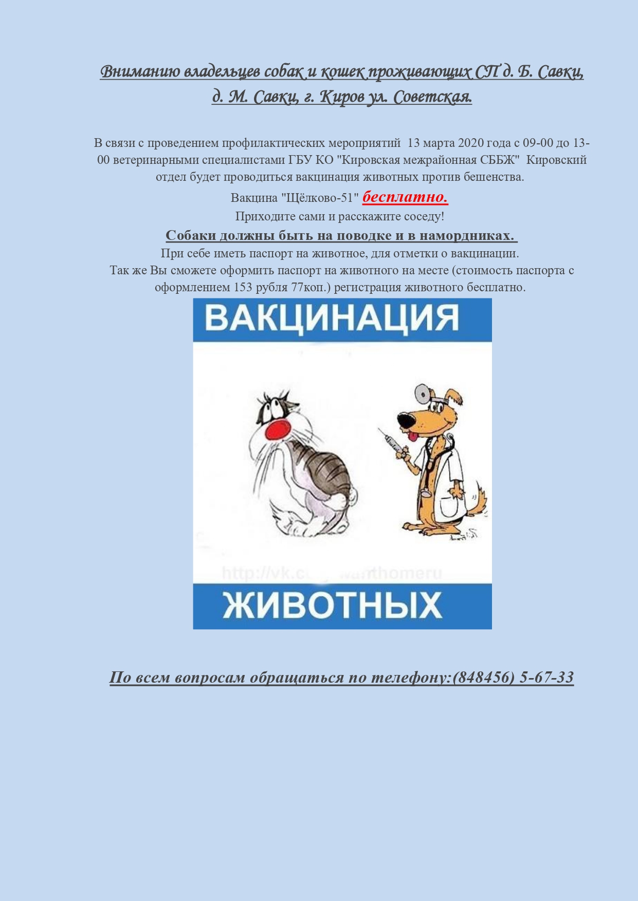 • Вниманию владельцев собак и кошек проживающих СП д. Б. Савки, д. М. Савки, г. Киров ул. Советская.