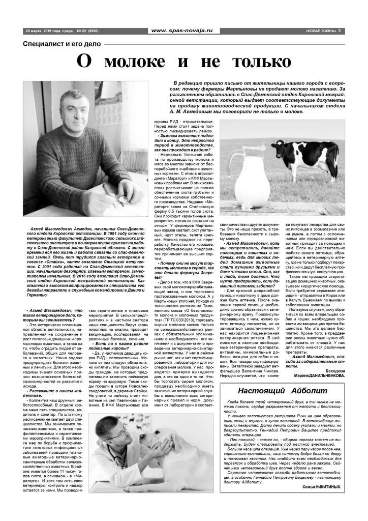 18 марта Спас-Деменская районная общественно-политическая газета «Новая жизнь» опубликовала статью - "О молоке и не только".